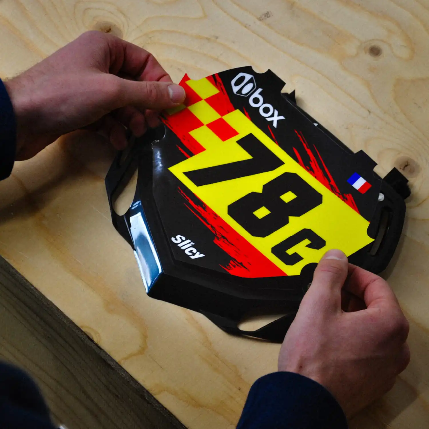 Delivered with the custom sticker (applied or not), the Box plate complies with UCI regulations.
